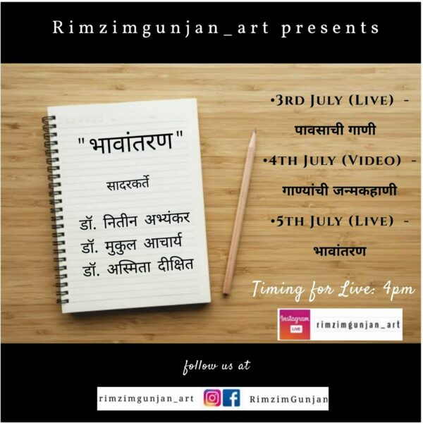 काव्यप्रेमींसाठी आजपासून तीन दिवस संध्याकाळी ४ वाजता “भावांतरण” हा एक सुंदर सोहळा Rimzimgunjan_art या इंस्टाग्राम अकाउंट वर आयोजिण्यात आला आहे. पावसाच्या सरी कोसळत असताना वाफाळलेला चहाचा कप हातात घेऊन घर बसल्या या कार्यक्रमाचा आनंद घेणं म्हणजे काव्य रसिकांसाठी मेजवानीच ठरणार आहे.