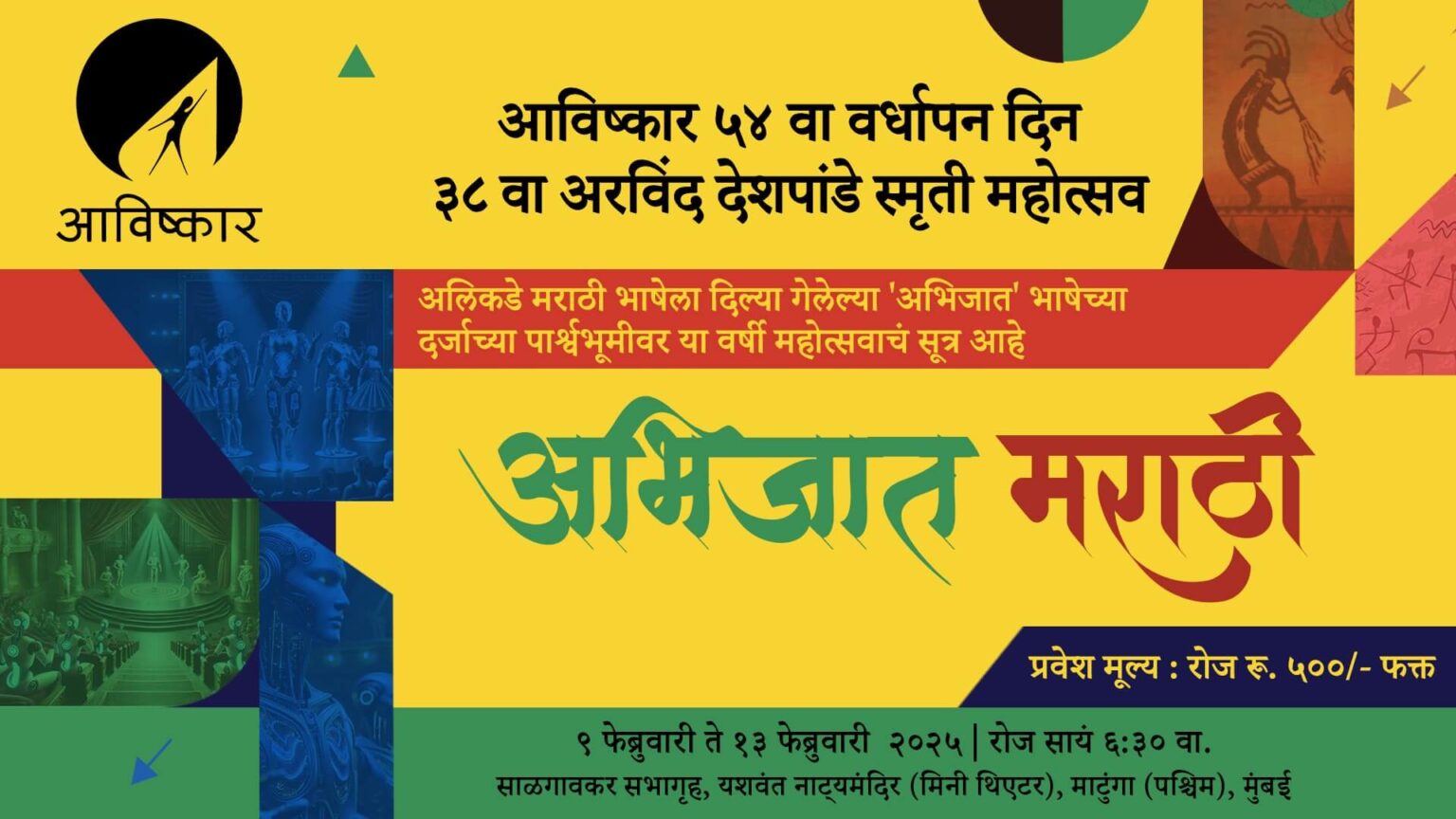 अरविंद देशपांडे (३१ मे १९३२ – ३ जानेवारी १९८७) हे एक प्रख्यात भारतीय चित्रपट, नाट्य व दूरदर्शन अभिनेते आणि नाट्य दिग्दर्शक होते. १९७१ मध्ये त्यांनी त्यांच्या पत्नी सुलभा देशपांडे यांच्यासोबत आविष्कार नाट्यगटाची स्थापना केली. आविष्कारचा ५४ वा वर्धापनदिन आणि अरविंद देशपांडे यांच्या स्मृतीप्रित्यर्थ ‘आविष्कार’ नाट्यसंस्थेतर्फे यावर्षीचा ३८ वा नाट्यमहोत्सव ९ ते १३ फेब्रुवारीदरम्यान माटुंगा पश्चिम येथील यशवंत नाट्यमंदिरच्या मिनी थिएटरमध्ये, म्हणजेच ‘साळगांवकर प्रायोगिक रंगमंच’ येथे पार पडणार आहे. अलिकडे मराठी भाषेला दिल्या गेलेल्या ‘अभिजात’ भाषेच्या दर्जाच्या पार्श्वभूमीवर या वर्षी महोत्सवाचं सूत्र आहे ‘अभिजात मराठी’. मराठी भाषा आणि इतर ज्ञानशाखा या अनुषंगाने ५ दिवस मान्यवरांची व्याख्याने आणि नाट्यप्रयोग असा महोत्सवाचा कार्यक्रम…