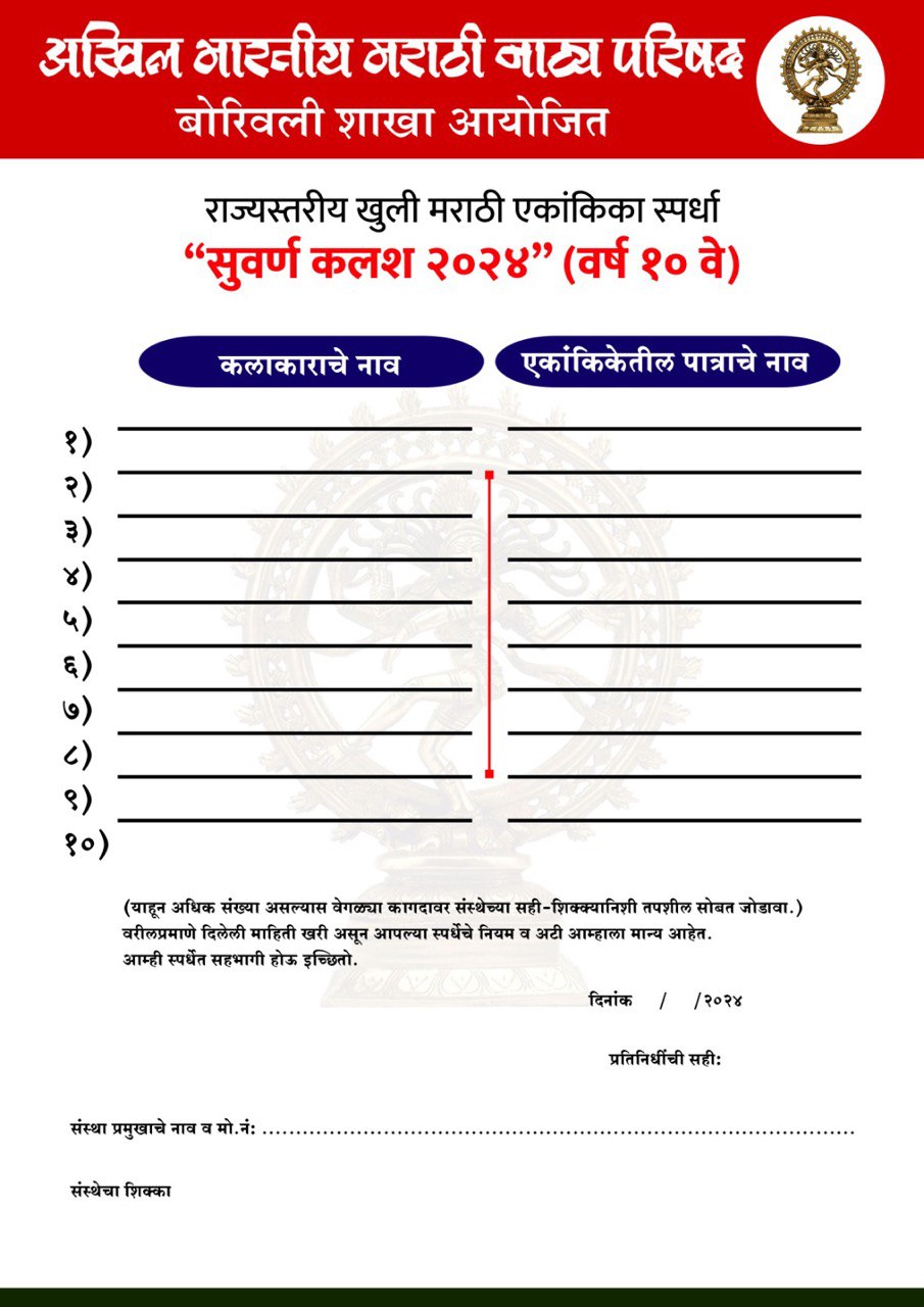 या स्पर्धेसाठी अर्ज स्वीकारण्याची अंतिम तारीख आहे २७ ऑगस्ट २०२४ संध्याकाळी ६ वाजेपर्यंत! आपले अर्ज अखिल भारतीय नाट्य परिषदेच्या बोरिवली शाखेच्या कार्यालयात किवा [email protected] या ईमेल आयडीवर स्वीकारले जातील. या स्पर्धेची प्रवेश फी आहे ₹२०००/- जी स्पर्धक प्रत्यक्ष कार्यालयात जाऊन किवा बोरिवली नाट्य परिषदेच्या बँक खात्यात NEFT द्वारे ट्रान्सफर करू शकतात.