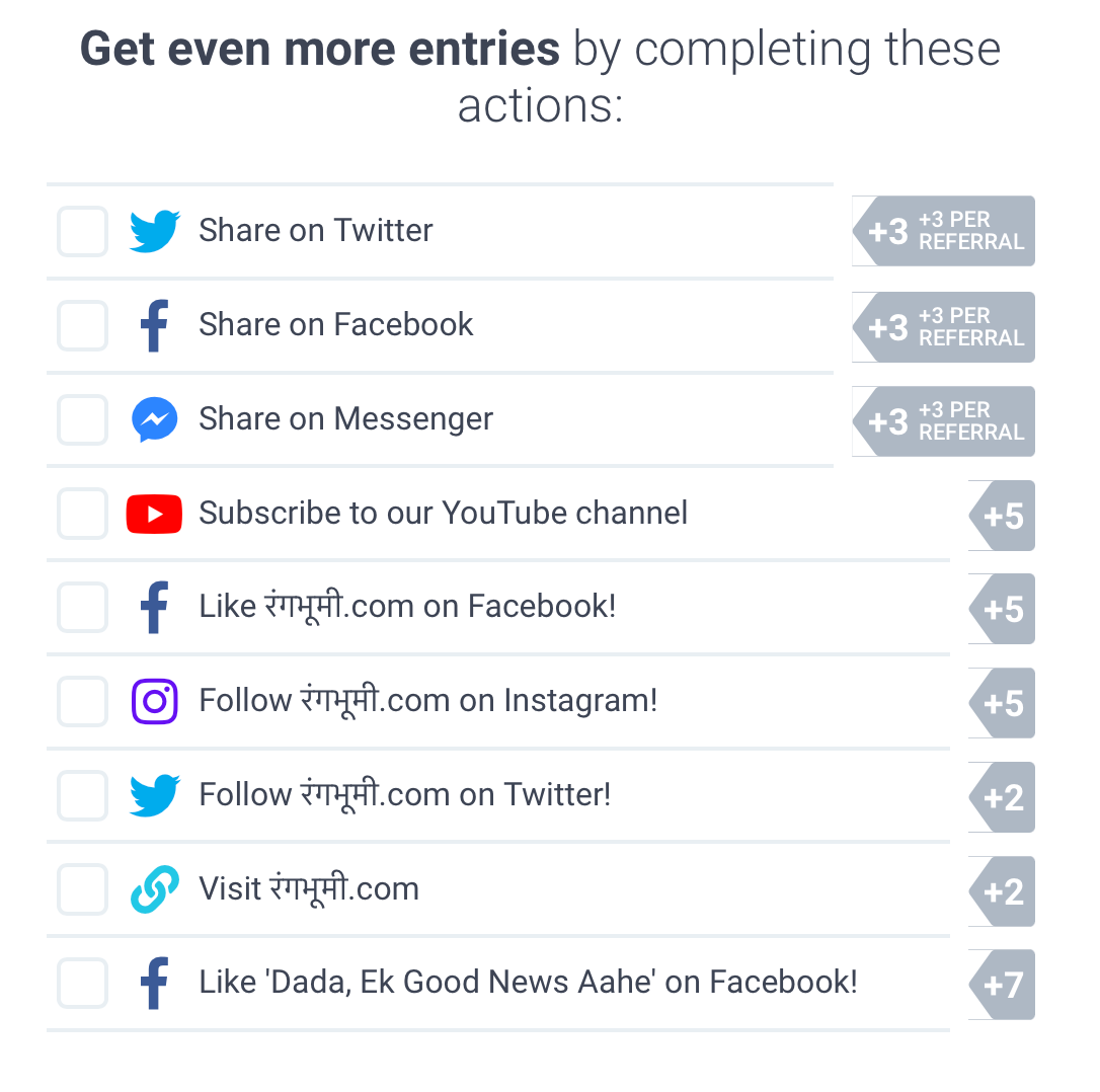 - आता तुम्हाला स्क्रीनवर एक यादी दिसेल. या यादीतील प्रत्येक कृती तुम्ही पूर्ण केली तुम्हाला त्या कृतीसमोर नमूद केलेले पॉईंट्स मिळतील. जास्तीत जास्त कृती पूर्ण करून तुम्ही जास्तीत जास्त ‘एन्ट्री पॉईंट्स’ मिळवू शकता. जेणेकरून, तुमची विजेता होण्याची शक्यता वाढेल.