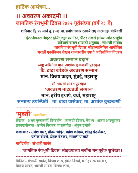 ह्या वर्षी जागतिक रंगभूमी दिवसाच्या पूर्वसंध्येला २६ मार्च रोजी सायंकाळी ४:३० वाजता बोरिवली येथे प्रबोधनकार ठाकरे लघु नाट्यगृहात ‘अवतरण अकादमी’च्या ‘जागतिक रंगभूमी दिवस’ सोहळ्याची रूपरेषा पुढीलप्रमाणे असणार आहे: