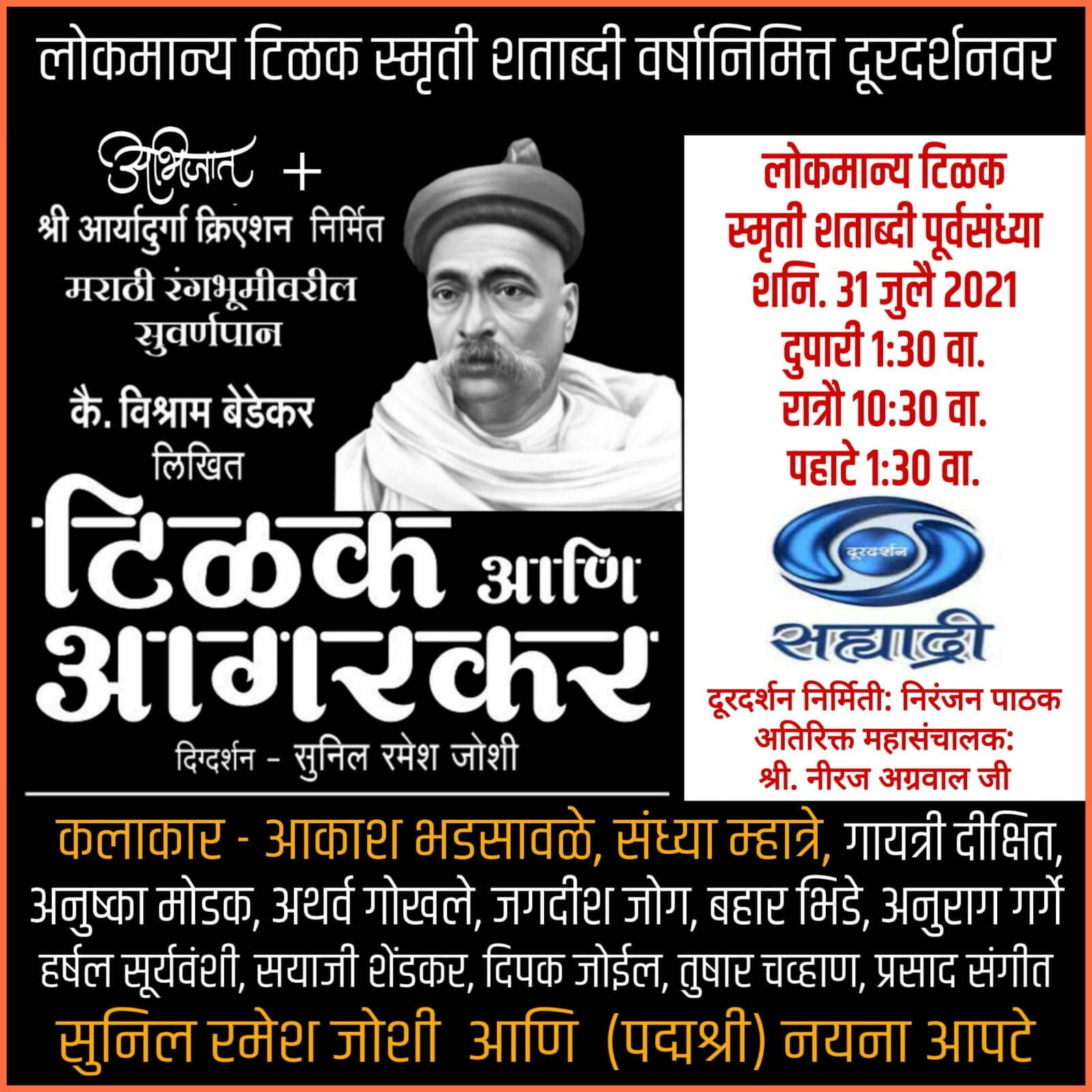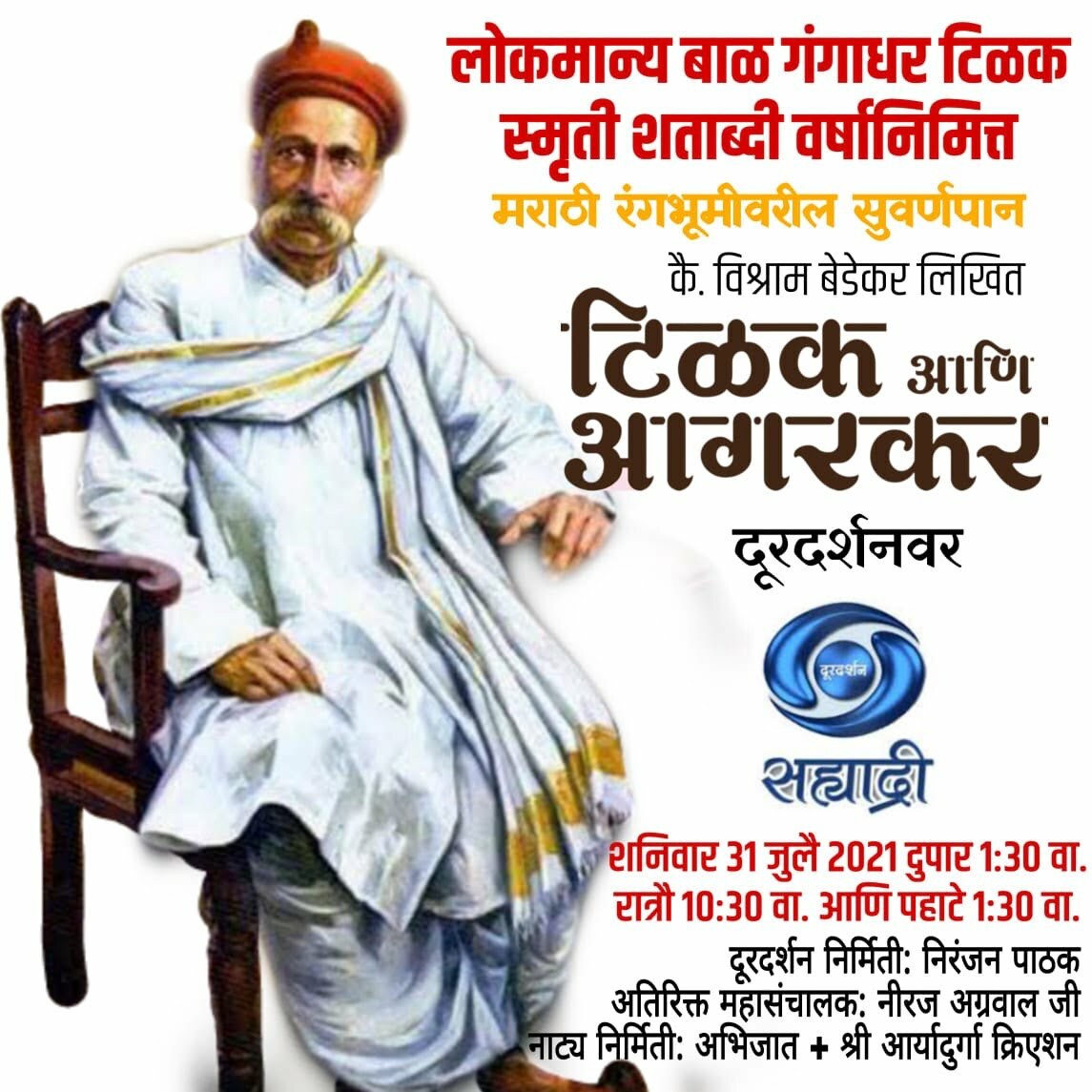 लो. टिळक स्मृती शताब्दी वर्षानिमित्त ‘टिळक आणि आगरकर’ हे अजरामर नाटक ३१ जुलै रोजी दूरदर्शनच्या सह्याद्री वाहिनीवर दाखवण्यात येणार आहे. अभिजात आणि श्री. आर्यादुर्गा क्रिएशन निर्मित हे नाटक म्हणजे मराठी रंगभूमीवरील सुवर्णपानच! आकाश भडसावळे, संध्या म्हात्रे, गायत्री दीक्षित, अनुष्का मोडक, अथर्व गोखले, जगदीश जोग, बहार भिडे, अनुराग गर्गे, हर्षल सूर्यवंशी, सयाजी शेंडकर, दिपक जोईल, तुषार चव्हाण, प्रसाद संगीत, सुनिल रमेश जोशी आणि (पद्मश्री) नयना आपटे अशा दिग्गज कलाकारांच्या अभिनयाने समृध्द असे हे नाटक घर बसल्या बघता येणे हे आपले अहो भाग्यच!