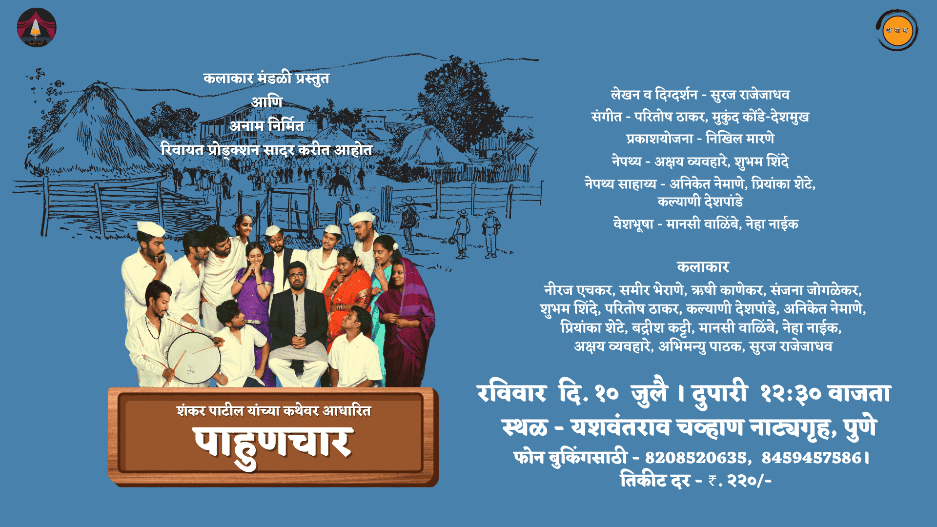 ही एकांकिका, सुप्रसिद्ध चित्रपट ‘पिंजरा’ ह्याचे लेखक ‘शंकर पाटील’ ह्यांच्या कथेवर आधारित आहे. दुर्मिळ होत चाललेली पाहुणचाराची पद्धत, गावकऱ्यांची आपुलकी, गावरान पद्धतीचा अस्सल पाहुणचार, परिचीत नसलेली रितभात व ह्या आपलेपणाचं अप्रूप वाटत असलेले बाहेरचे सदस्य, अशा साध्या धाटणीच्या संहितेवर आधारित ‘पाहुणचार’ ही एकांकिका पाहण्यासारखी आहे. शिक्षण घेण्यासाठी बाहेर गेलेला अण्णांचा मुलगा वसंता जेव्हा मास्तरांना गावात घेऊन येतो तेव्हा गावात आणि मास्तरांसोबत झालेल्या गमतीजमती ह्या नाटकात दाखवल्या आहेत. गावातील लोकांची मनाची अनेक रुपं व विविध पात्रांमध्ये रमणारं गाव ह्या नाटकात बघायला मिळतं. ह्या नाटकात मुख्य पात्र अण्णा, मास्तर, वसंता व गावकरी आहेत. पाहुणचार कसा असावा दाखवणारं हे हलकं फुलकं नाटक नक्की पहा!