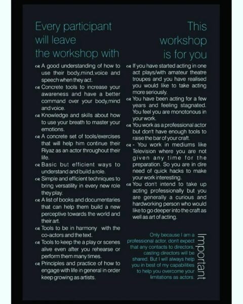 या कार्यशाळेत आवाज, वाणी, शरीर यांचा उत्तम वापर आणि त्यावरील नियंत्रणाबद्दल शिकवण्यात येणार आहे. भावनांवर आणि श्वासावर प्रभुत्व मिळवणे आणि अभिनेता बनण्याच्या प्रवासात उपयोगी ठरणारी पुस्तके आणि माहितीपटाची यादी देण्यात येणार आहे. कॉन्स्टॅटाइन स्टॅनिसाव्स्की, मायकेल चेखोव्ह, जर्टझी ग्रोटोव्स्की आणि कुड्डीअट्टम यांच्या काही पद्धतीनुसार मार्गदर्शन करण्यात येणार आहे. कलाकार म्हणून वाढत राहण्यासाठी सर्वसाधारणपणे जीवनात कसे सहभागी व्हावे याची तत्त्वे आणि सराव करून घेण्यात येणार आहे. एका कलाकाराने नवनवीन कलाकार घडवले पाहिजे आणि हेच उत्तम कार्य करतोय अभिनेता सुव्रत जोशी.