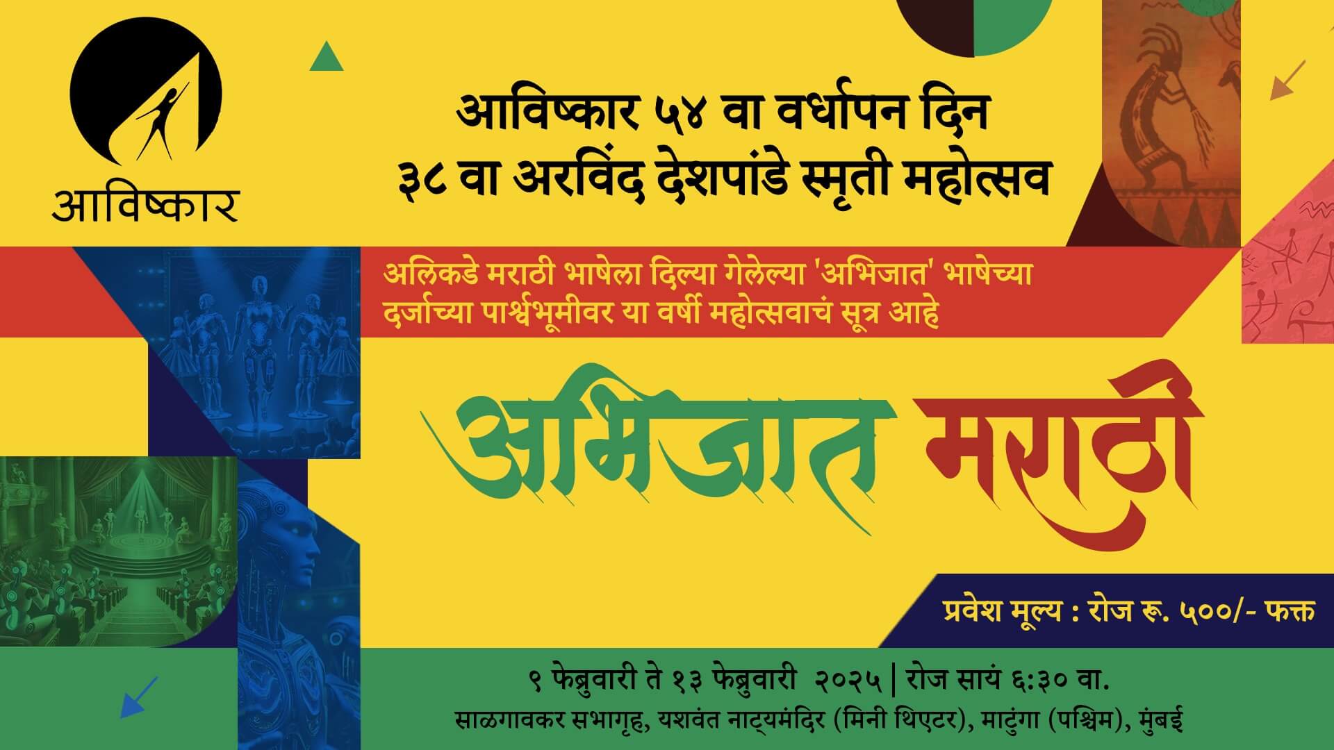 आविष्कारचा ५४ वा वर्धापनदिन आणि अरविंद देशपांडे यांच्या स्मृतीप्रित्यर्थ ‘आविष्कार’ नाट्यसंस्थेतर्फे यावर्षीचा ३८ वा नाट्यमहोत्सव ९ ते १३ फेब्रुवारीदरम्यान माटुंगा पश्चिम येथील यशवंत नाट्यमंदिरच्या मिनी थिएटरमध्ये, म्हणजेच ‘साळगांवकर प्रायोगिक रंगमंच’ येथे पार पडणार आहे.