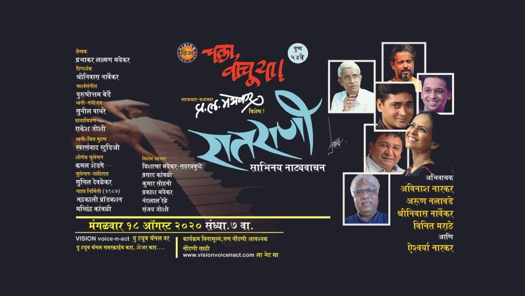 ज्येष्ठ नाटककार प्र. ल. मयेकर म्हणजेच प्रभाकर लक्ष्मण मयेकर यांच्या समर्थ लेखणीतून जन्माला आलेल्या “रातराणी” या अप्रतिम नाटकाचे अभिवाचन करायला…